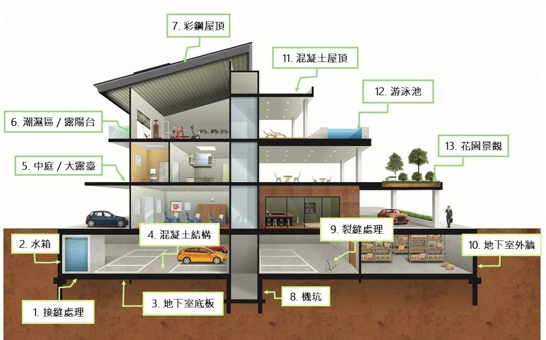 防 水 工 程 提供以下防水工程項目 1.接縫處理2.水箱防水3.地下室底板4.混凝土結構5.中庭 / 大露臺6.潮濕區 / 露陽台7.彩鋼屋頂 8.機坑9.裂縫處理10.地下室外牆11.混凝土屋頂12.游泳池13.花園景觀 大底防潮 屋頂防水 屋頂防水 屋頂防水 屋頂防水 施作止水膏止水條 結構體防水 外牆防水毯